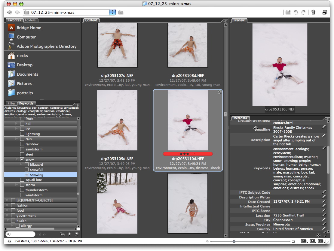 The Bridge version that ships with Creative Suite 4 applications includes an expanded set of features and in certain ways resembles some cataloging programs. Since various Adobe Creative Suite products include Bridge, photographers just starting out tend to use it for editing, organizing and embedding metadata in their images. Those with an itch for speed may move on to other applications, but it is useful to understand how Bridge works, since you are likely to use it at some point for accessing images.