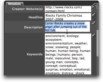 By right-clicking or (on a Mac) control-clicking on an image and choosing File Info, or accessing File Info under the File menu, we see the same metadata fields within the same dialogue we as when selecting File Info in Adobe Photoshop CS through CS4 - except for one difference: The Bridge version of File Info allows you append or change the metadata in a JPEG file without recompressing the image.