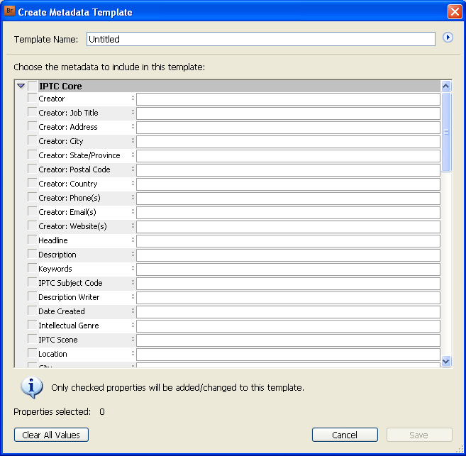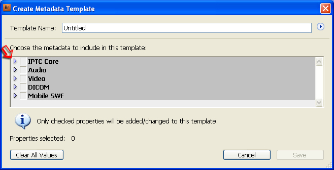 When you first open the Create Metadata Template dialogue, all the various metadata properties may only be visible as a single item. Also note at the bottom of the dialogue that only checked properties will be added or changed in this template. If you click on the arrow at the left side of any of the metadata groupings, it will expand to show the full range of fields, such IPTC Core shown below.