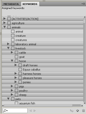 One of the advantages of using Bridge is the Keyword panel. This feature allows you to import or construct a list of terms arranged with narrower terms located beneath broader.