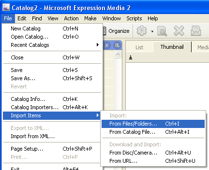 To bring images into Expression Media use the Import Items option under the File menu and choose the From Files/Folders (shortcut Command/Ctrl+I), or simply drag and drop a folder of images on the Expression Media window. With Import Items, you can directly access options - such as file size or modification date - to limit which files you import. In the same sub-menu, you'll see an option to import another Expression Media or iView Media Pro catalog file. You can also import images directly from a camera, a memory card or even a specific Internet URL (address).