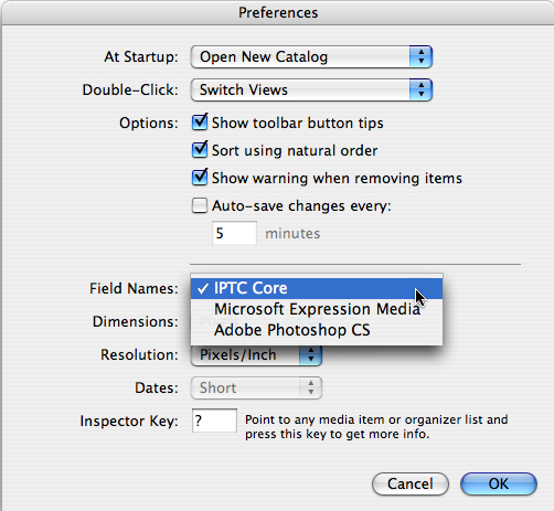 You have three options for viewing field name labels in the program's Info panel: IPTC Core, Microsoft Expression Media and Adobe Photoshop CS. Choose one in Preferences, under the Edit menu for Windows, or the Expression Media (iView Media Pro) menu for Mac. We recommend use of the IPTC Core settings. This option emphasizes the field names preferred by the IPTC, which are not specific to any particular product and should be most familiar to those using newer applications.