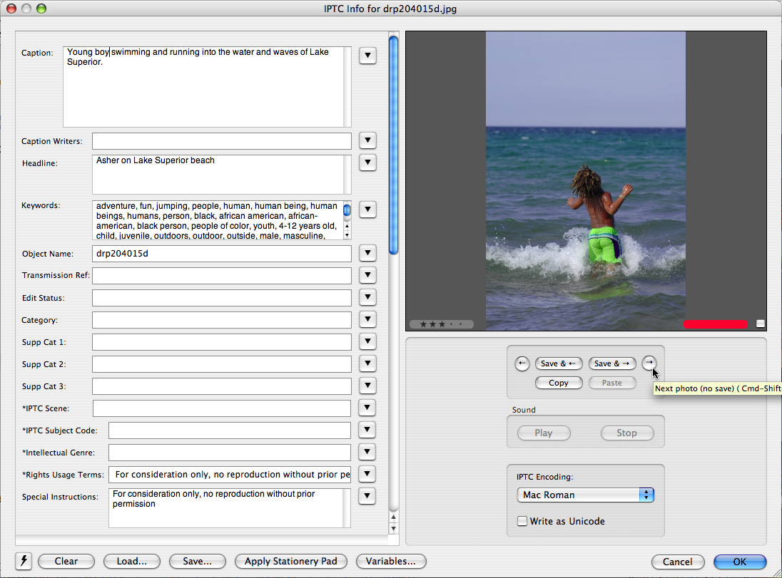 While it’s possible to fill fields with metadata, and choose Copy before clicking on the Save & -> button and Paste it into the next image, it is much easier to use Photo Mechanic’s IPTC Stationary Pad for batch annotations. This stationary pad is much the same as the metadata templates in other programs, making it easy to enter the same metadata for several or many images at the same time. If you use that option, the IPTC Info dialogue provides an easy method to fine tune captions or keywords that change from image to image.