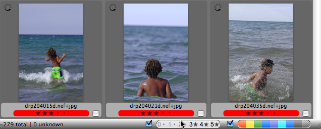 After rating images, you can easily show or hide those of a specific rating with the filters found in the lower-right border of the contact sheet view. Used in conjunction with color labels it's very easy to pinpoint your best images, or to pull together a set you need to process into a contact sheet, web gallery or set of images to email.