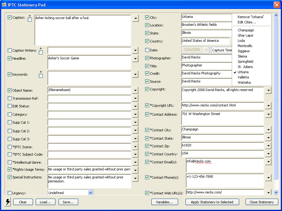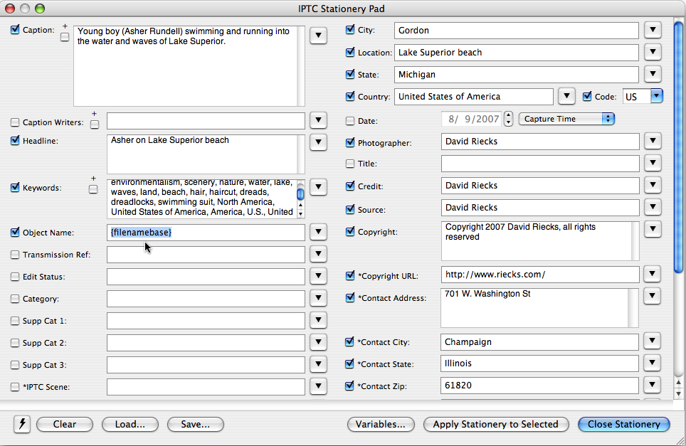 The key difference from the standard IPTC Info dialogue is you can select a group of images in a folder and apply the contents of the IPTC Stationery Pad. All field entries are retained from the last use, unless you used the Clear button to selectively remove them. Select images with your shift or control/command keys, just as you do with most other applications. You can then load a previously saved template, or use the information left from the last entry. If you click in a field and start typing, a checkmark will appear in a box next to the field, indicating it will be added to the image when you press the Apply Stationery to Selection button.