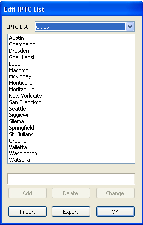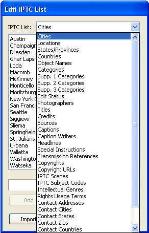 When you first open a pick-list menu, there is an option to edit the values for that field. Click on that Edit (named field) option to bring up the Edit IPTC List dialogue, where you can enter any number of items and add them to the list. Selecting terms from these lists ensures all the spellings and letter cases will be the same. This can result in fewer problems when searching for images with those terms. Note there is a drop-down list at the top to allow direct access to all Stationery Pad field data lists.