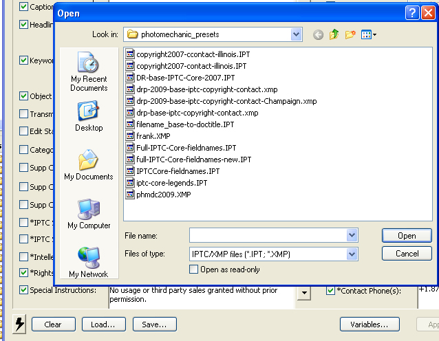 The Load button allows you to import a previously saved set of values. Photo Mechanic can either load XMP metadata templates (such as those created by Adobe applications) or .IPT files (a format used by earlier versions of Photo Mechanic) from a location you choose. It will automatically check the box next to each value to include when the “Apply Stationery to Selected" button is pressed. The Save button allows you create a template for later use. You can save the template as either an .XMP or a .IPT file.