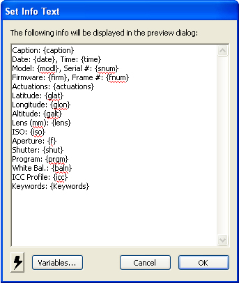 There are many options besides showing just the Exif or other standard IPTC fields. Within the Set Info TooltipsVariables… button to bring up the entire set. It includes GPS, ICC and many other data types. Near the end of this very long list, you will find a set of IPTC variables. If you choose Caption, Capt, {caption} will appear in the field where the cursor was last located. If you type Caption: it will read Caption: {caption} when you mouse over with the Show Info Tooltips option turned on. dialogue, click on the
