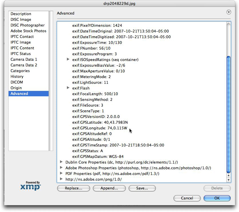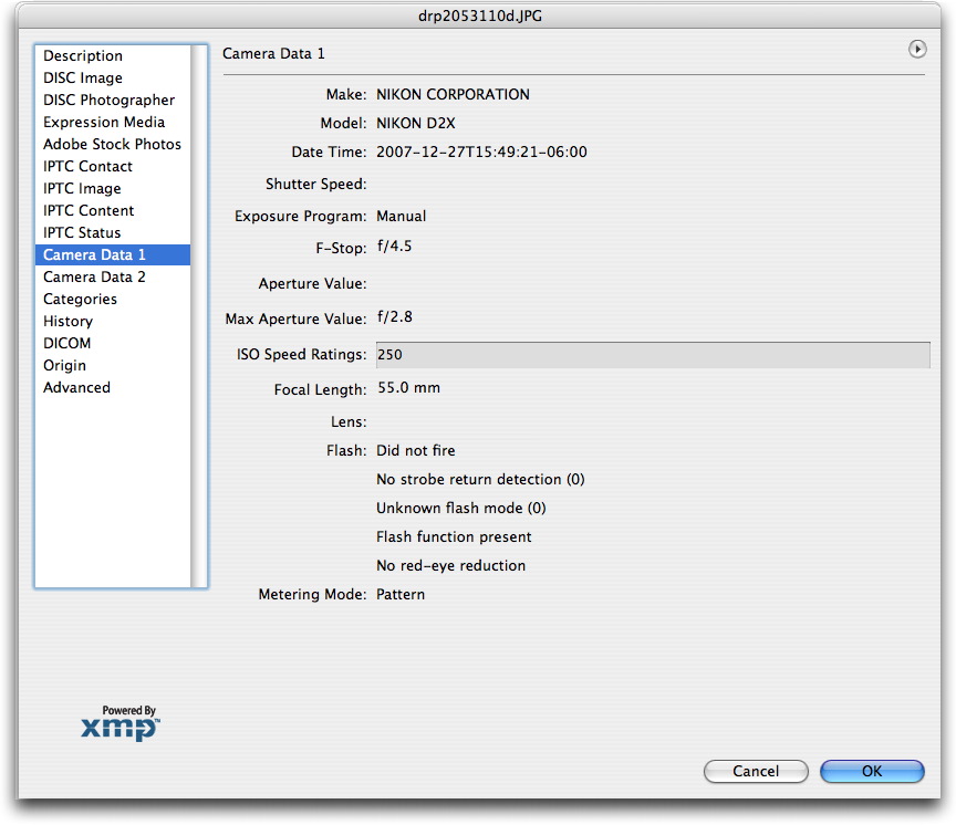 If viewing an image captured with a digital camera, you can click on the Camera Data (1 and 2) panels and see details such as the make and model of camera, aperture, shutter speed settings and more (including latitude and longitude in cameras equipped with or connected to a GPS device). CS4 has a single Camera Data Tab with the older Camera Data 1 and 2 Sections combined. Digital cameras automatically generate this information each time the shutter releases. They store these data within the Exif (Exchangeable Image File) metadata area of a digital file.