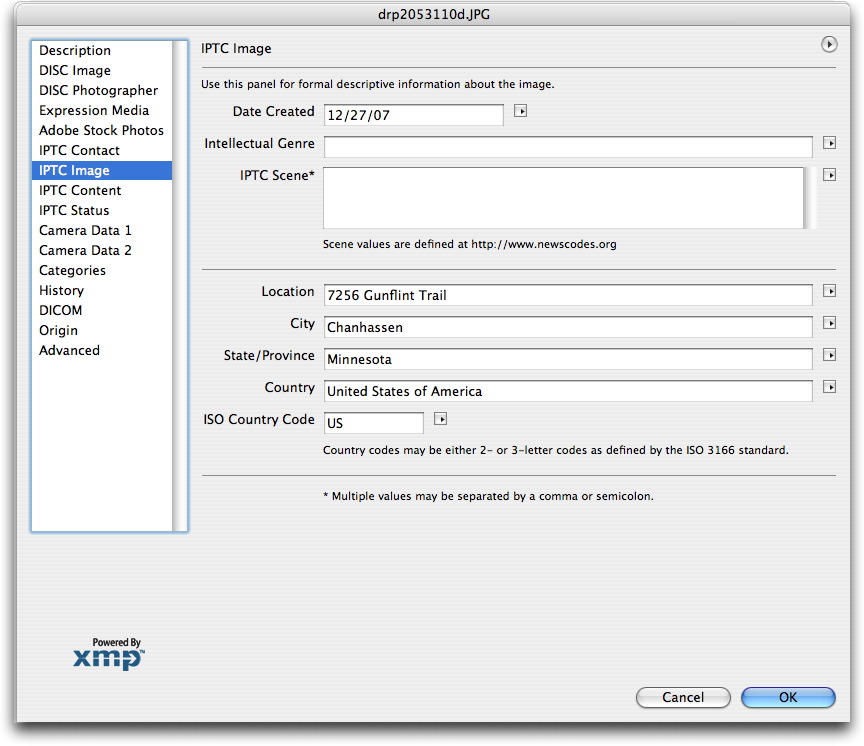 Within the Origin panel, you can list information such as the geographic location (City, State/Province and Country), as well as things such as the Source of the image, how the image should be credited, a headline (a shortened caption) and other specialized instructions. For details on how to populate these fields, see the Guide to Photo Metadata Fields or download the IPTC User's guide.